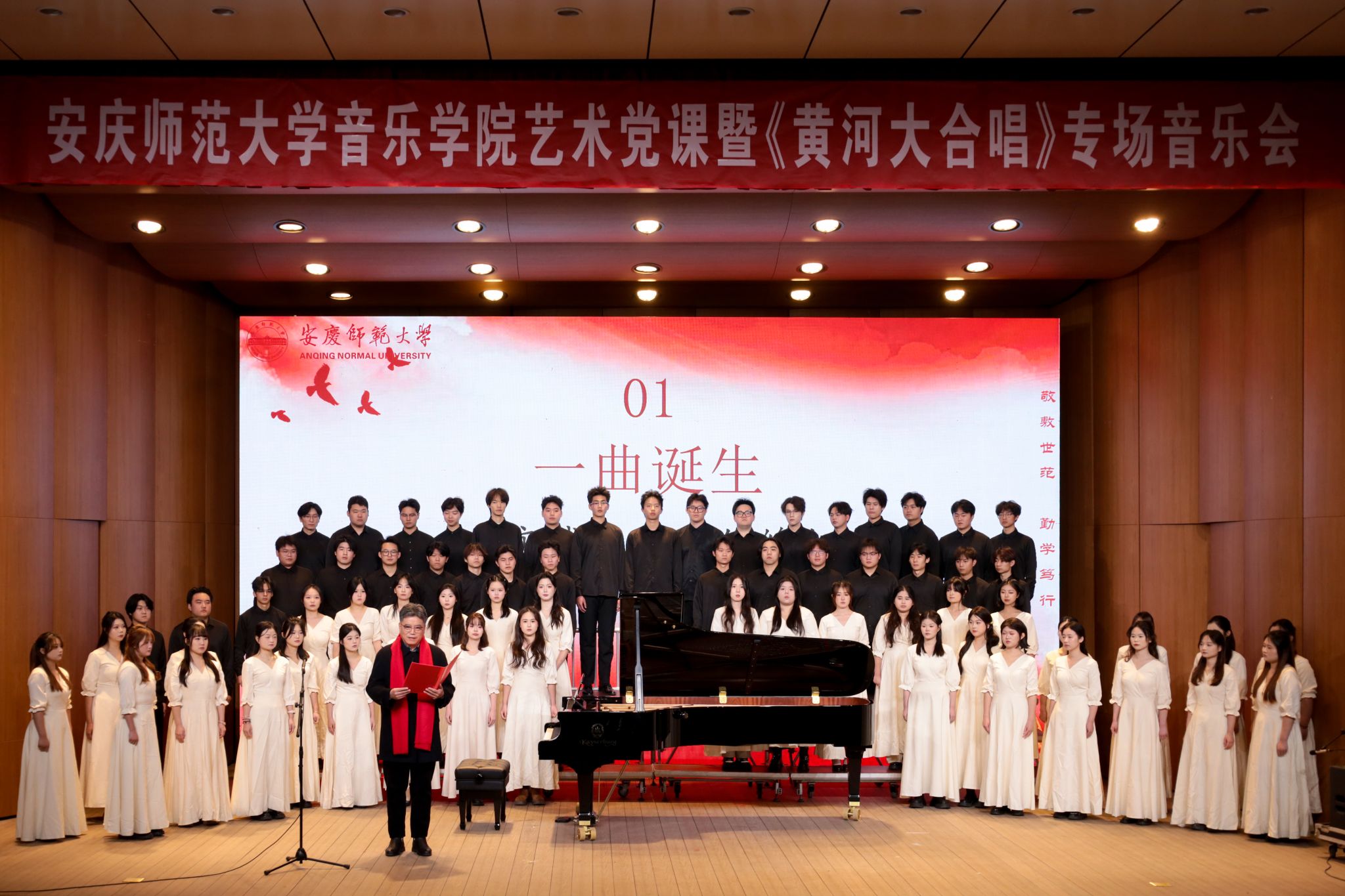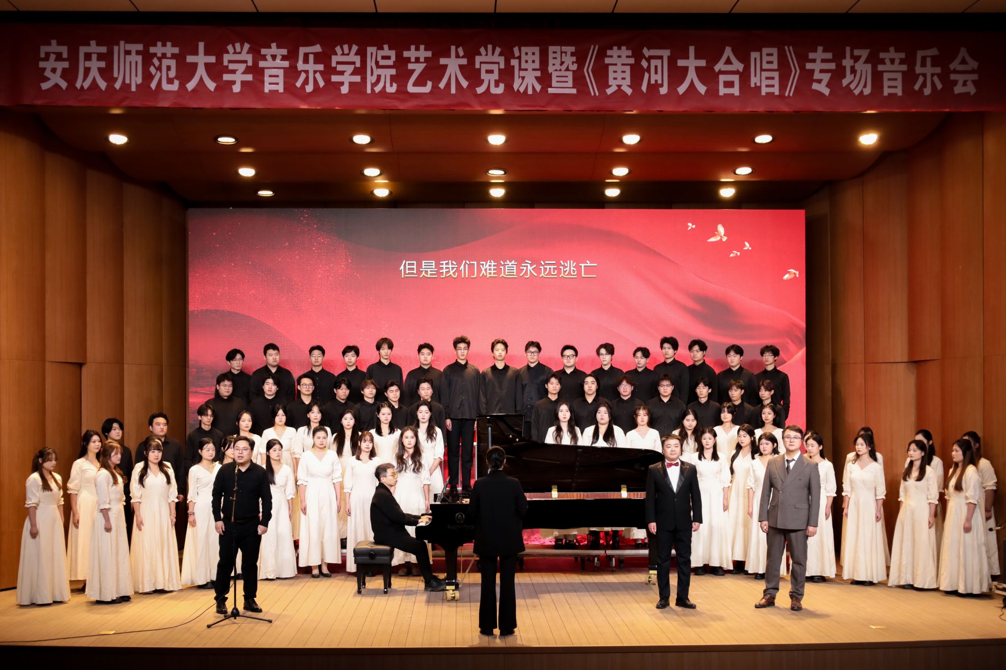 激昂的混声合唱、深情的诗歌朗诵、悲怆的独唱……艺术党课暨《黄河大合唱》专场震撼人心。演出在《黄河船夫曲》粗犷有力的号子声中拉开序幕,合唱队员们歌声紧凑,仿佛再现了与风浪搏斗的惊险场面。随后,《黄河怨》的独唱响起,女歌者声音凄婉,唱出了无尽的悲苦与控诉,深深感染了现场观众。